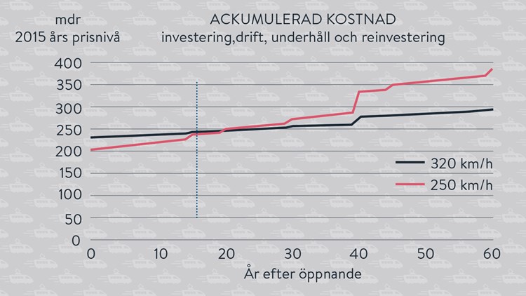 Att bygga för 320 km/h är enligt Trafikverket cirka 25 miljarder kronor dyrare än att bygga för 250 km/h. Den i sammanhanget marginellt högre investeringskostnaden vägs dock med råge upp av en avsevärt lägre underhållskostnad. Redan 20 år efter trafikstart skulle den sammanlagda kostnaden för 250-alternativet överstiga kostnaden för 320-alternativet. Med en beräknad livslängd på 80-100 år skulle en stor kostnadspost skjutas över på kommande generationer.