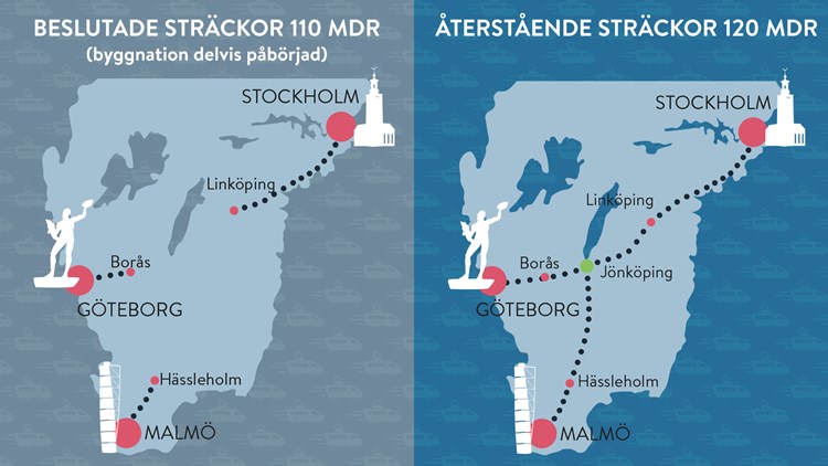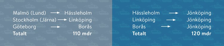 De nya stambanorna är kostnadsberäknade till 230 miljarder kronor. Sträckorna närmast storstäderna är redan beslutade och kostnadsberäknade till 110 miljarder kronor. Det är bra, men byggs de tre delsträckorna inte ihop blir nyttan av investeringen begränsad i jämförelse med nyttan av ett sammanhängande system.