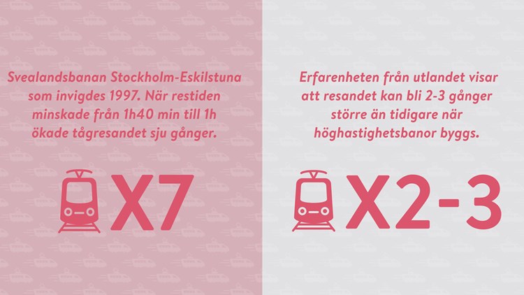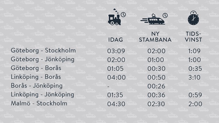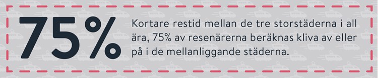 Med en sammanhängande modern järnväg, ibland kallad höghastighetsjärnväg, kortas restiden med tåg mellan Göteborg och Stockholm med mer än en timme och med drygt två timmar mellan Stockholm och Malmö. Tåget kommer då att vara det snabbaste och miljövänligaste färdsättet mellan våra tre storstäder. 75 procent av resenärerna beräknas dock kliva på och/eller av vid någon av de mellanliggande städerna. Järnvägen gynnar alltså i första hand dem som pendlar regionalt.