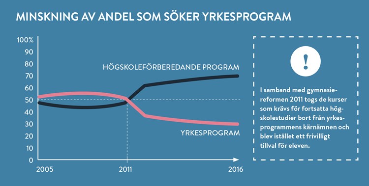 Samtidigt ser vi hur unga i allt större utsträckning väljer bort yrkesprogrammen på gymnasiet till förmån för de högskoleförberedande. Sedan 2005 har yrkesprogrammen tappat nästan var tredje elev. Sveriges största gymnasieprogram är idag samhällsprogrammet och det femte största är estetprogrammet. Ämnesområden som leder till yrken där det redan idag råder stor konkurrens om jobben och där arbetsmarknaden beräknas vara mättad också i framtiden.