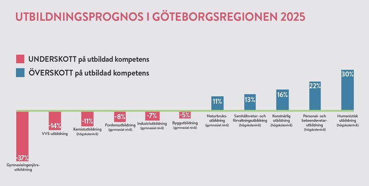 Särskilt stort är idag behovet av yrkesutbildad kompetens. När vi med hjälp av uppgifter från Västra Götalandsregionen spanar in i framtiden så är det fortfarande underskottet på yrkesutbildade som sticker ut mest. Störst överskott förväntas det bli på högskoleutbildade inom humaniora, konst, samhällsvetenskap och förvaltning. Efterfrågan på civilingenjörer beräknas till år 2025 vara fem gånger högre än på samhällsvetare, hur stort underskottet blir är svårbestämt, varför det heller inte redovisas.