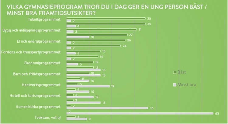 Dessutom tror 83 procent att industrin kommer att ha en likvärdig eller ökad betydelse för svensk ekonomi i framtiden. 75 procent tycker att politiken bör prioritera utvecklingen av svensk industri. Vad avser inställningen till utbildning uppger 84 procent att de skulle reagera positivt om en ung vän, bekant eller familjemedlem börjar studera vid ett industritekniskt program på gymnasiet. Hela 94 procent är positivt inställda till lärlingsutbildningar på gymnasienivå.