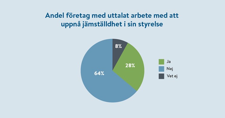 Forskning, från bland annat Almi Företagspartner, visar att ett aktivt och uttalat styrelsearbete är första steget mot att uppnå ökad jämställdhet i styrelser. I vår mätning framkommer det att drygt 3 av 5 bland de tillfrågade bolagen inte har ett aktivt arbete med ökad jämställdhet i styrelsen. Drygt 1 av 4 anger att de har ett aktivt arbete för en mer jämställd styrelse samtidigt som en liten andel, 8 procent, inte vet om företaget bedriver ett arbete inom området eller ej.