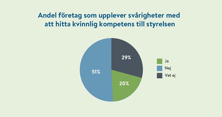 På frågan om bolagen upplever svårigheter med att hitta kvinnor med rätt kompetens för styrelseuppdrag svarar 1 av 5 att det är en utmaning. Samtidigt säger hälften av företagen att det inte är det, och 2 av 5 anger att de inte vet om det är svårt eller ej.