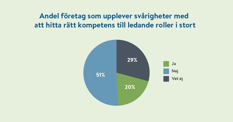 På frågan om det är svårt att hitta kvinnlig kompetens till ledande roller i verksamheten i stort anger drygt 3 av 5 att det inte är det. Nära 2 av 5 upplever trots allt att det är svårt att hitta kvinnor med rätt kompetens till ledande roller samtidigt som endast en liten andel, 9 procent, svarar att de inte vet om det är svårt eller ej.