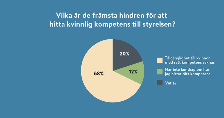 Till de företag som uppgav att det finns svårigheter med att hitta kvinnlig kompetens till styrelsen ställde vi en följdfråga. På denna fråga anger nära 4 av 5 att tillgängligheten på kvinnor med rätt kompetens saknas. Samtidigt anger 1 av 5 att det finns andra orsaker till svårigheter med att hitta kvinnor till styrelsen. Däribland nämns att det är ett familjeföretag, ointresse bland kvinnor för den bransch som företaget är i samt att bolaget har utländska ägare med en annan kultur. En liten andel, 12 procent, anger att de inte har kunskap om hur de hittar kvinnlig kompetens till styrelsen.