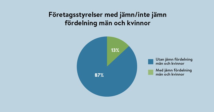 För att bilda oss en uppfattning om hur jämställda bolagens styrelser är i dagsläget, undersökte vi även den nuvarande fördelningen mellan män och kvinnor i bolagsstyrelserna. Handelskammarens mätning visar att i 19 av 147 fall är det jämnt fördelat mellan män och kvinnor och att det bara är 7 av 147 företag som har en majoritet kvinnor i styrelsen. Det visar, i likhet med en mätning från Almi Företagspartner, som pekar på att endast 15 procent av bolagens styrelser är jämställda, att differensen mellan antalet män och kvinnor i västsvenska bolagsstyrelser är allt för stor. Resultaten indikerar i sin tur att avsaknaden av ett aktivt styrelsearbete återspeglas i verkligheten.